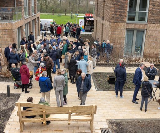 Bewoners en omwonenden van het nieuwe complex verzamelen zich in de gemeenschappelijke tuin voor de feestelijke opening op dinsdag 12 maart. De stemming is goed. De meeste nieuwe bewoners zijn inmiddels verhuisd. Hubert Knijnenburg is een van hen. Hij betrok eind november zijn nieuwe appartement. “Het is hier geweldig”, zegt hij enthousiast. “Het is stil in huis en ik ben zo blij met mijn buren. Ik ken inmiddels al aardig wat mensen. Weet je waar ik ook heel blij mee ben? Door de zonnepanelen en vloerverwarming is mijn energierekening enorm veel lager. Ik ben van 280 euro per maand naar een energierekening van 75 euro per maand gegaan. En dat terwijl mijn huur maar drie tientjes hoger is.”